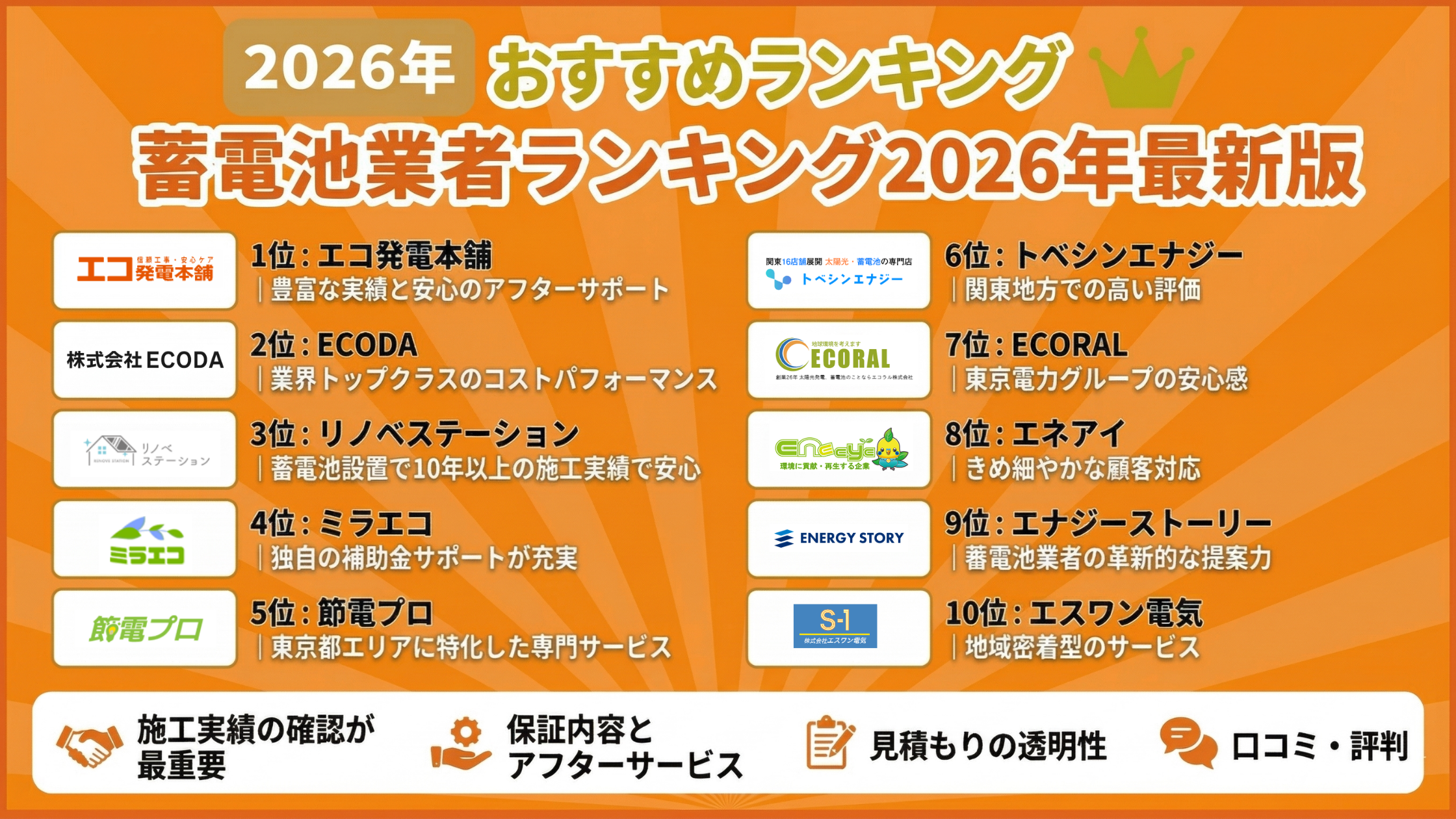 蓄電池の導入を検討している方にとって、信頼できる業者選びは成功の鍵となります。価格だけでなく、施工品質やアフターサービスの充実度も重要な判断基準です。ここでは、施工実績・価格の透明性・アフターサポート体制・口コミ評価などを総合的に評価し、おすすめの蓄電池業者10社をランキング形式でご紹介します。