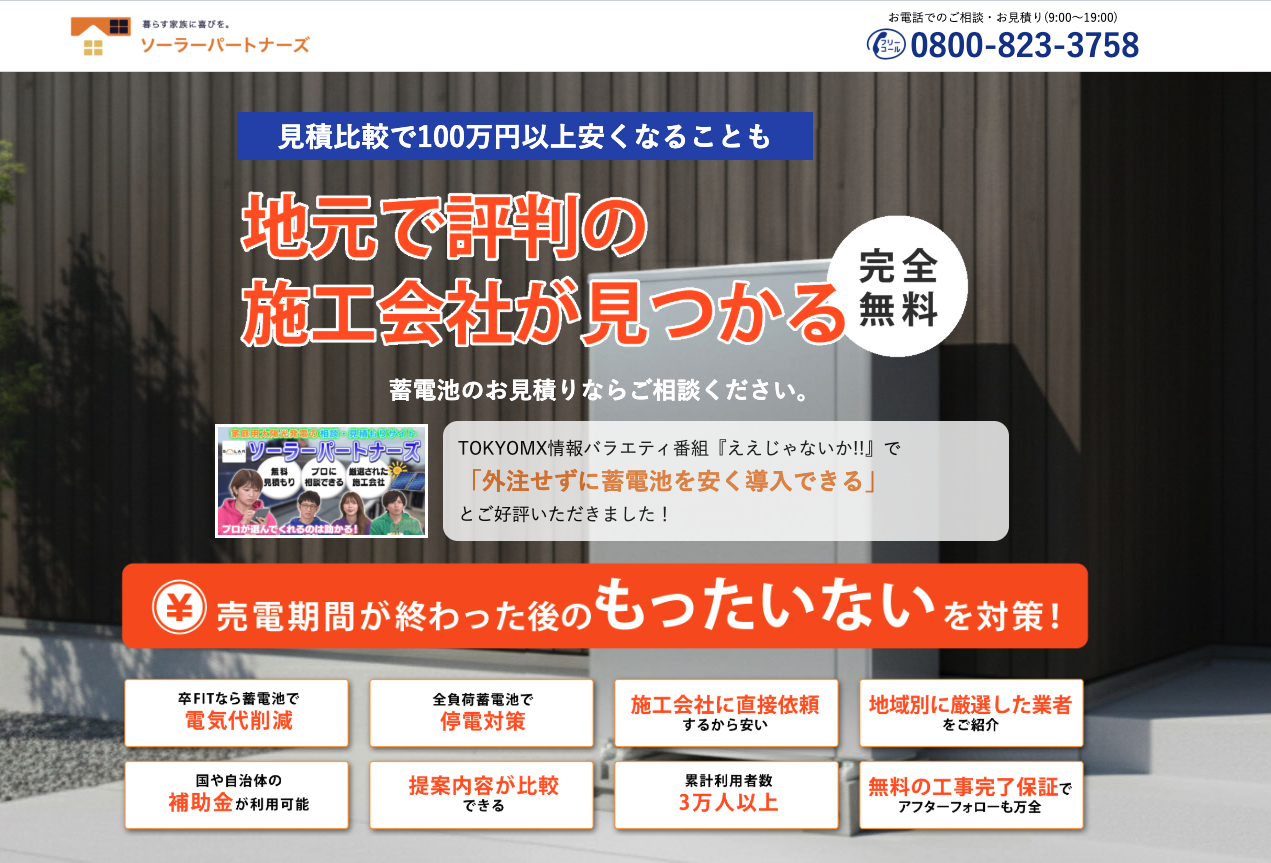 特徴は、卒FIT(固定価格買取制度の終了)後の最適化提案に強い点です。太陽光発電をすでに設置している家庭向けに、どの蓄電池を選べば経済効果が最大化しやすいかをシミュレーションできる業者が見つかりやすい傾向があります。簡易見積もりにも対応しており、まず概算を知りたい方にも使いやすい設計です。