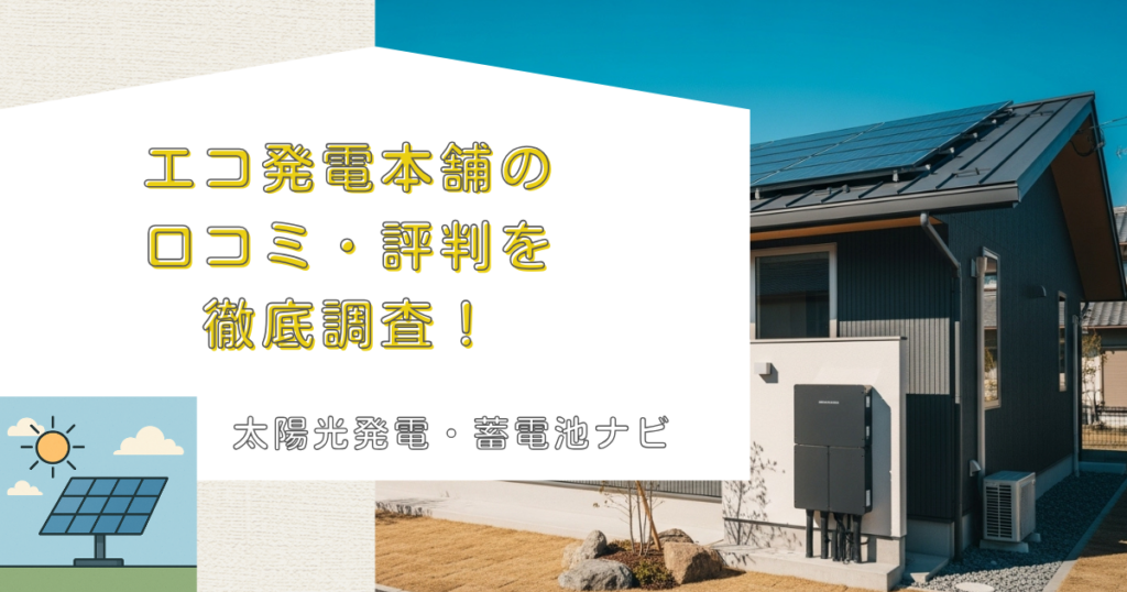 太陽光発電や蓄電池の導入を検討する際、多くの方が業者選びで悩まれるのではないでしょうか。特に価格面やサービス品質、アフターサポートなど、実際の利用者の声を参考にしたいと考える方も多いはずです。この記事では、エコ発電本舗の口コミや評判につ... -